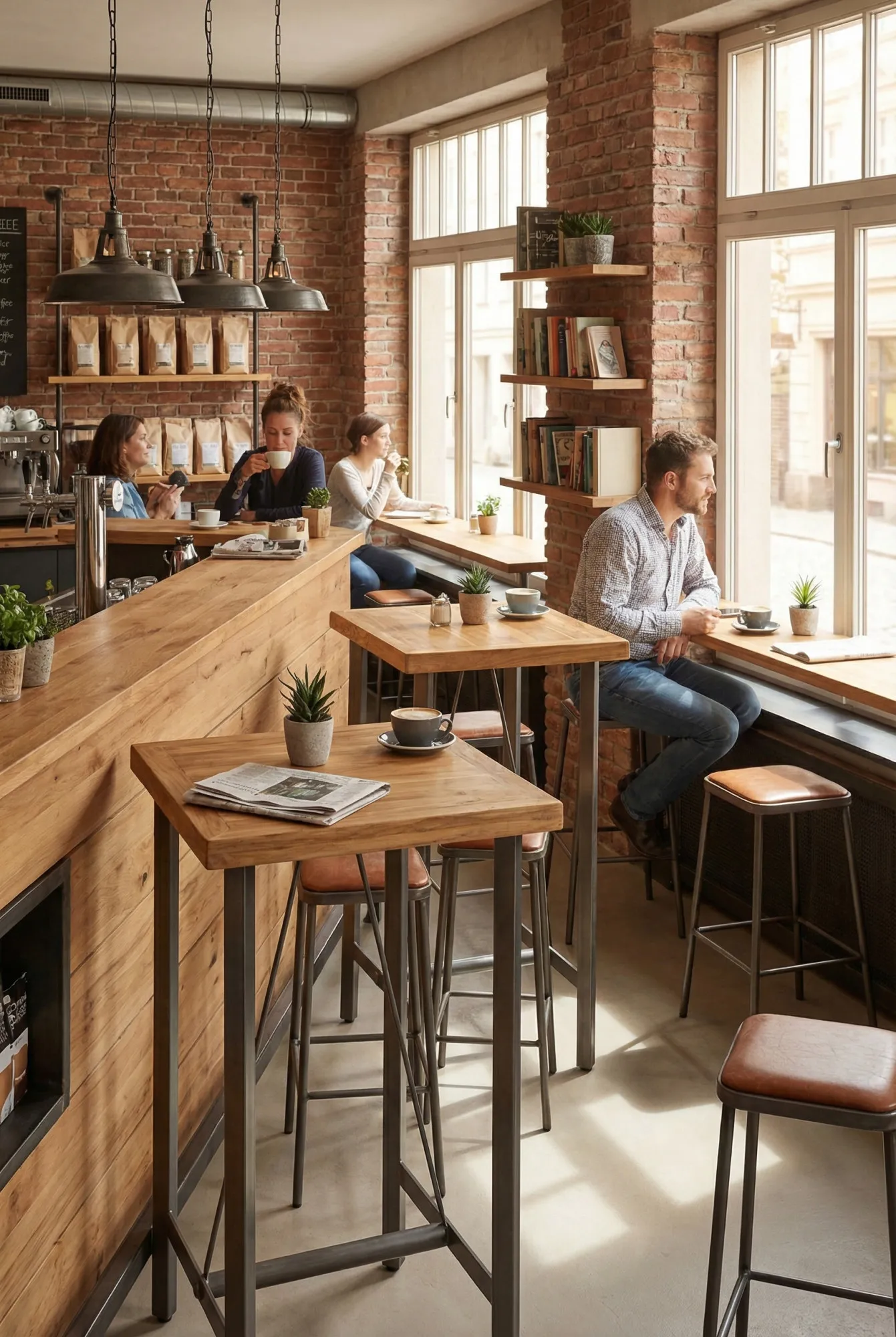 Aranżacja kawiarni ze stolikami barowymi z drewna tekowego Kubbi 2X