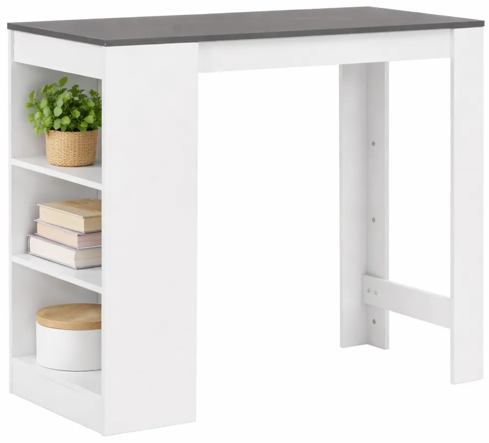 Nowoczesna forma stolika barowego April czyni go ciekawym dodatkiem do Twojego salonu, kuchni lub jadalni. To idealny wybór nawet dla małych wnętrz, ponieważ ten mebel pozwoli Ci skutecznie zaoszczędzić miejsce w Twoim domu. Na uwagę zasługuje także jego konstrukcja z potrójnymi półkami, na których możesz postawić np. produkty spożywcze. Prostokątny blat zapewni Ci natomiast odpowiednią ilość miejsca na posiłki i napoje, a dwie nogi i boczna kolumna z półkami nadadzą temu produktowi odpowiednią stabilność.
