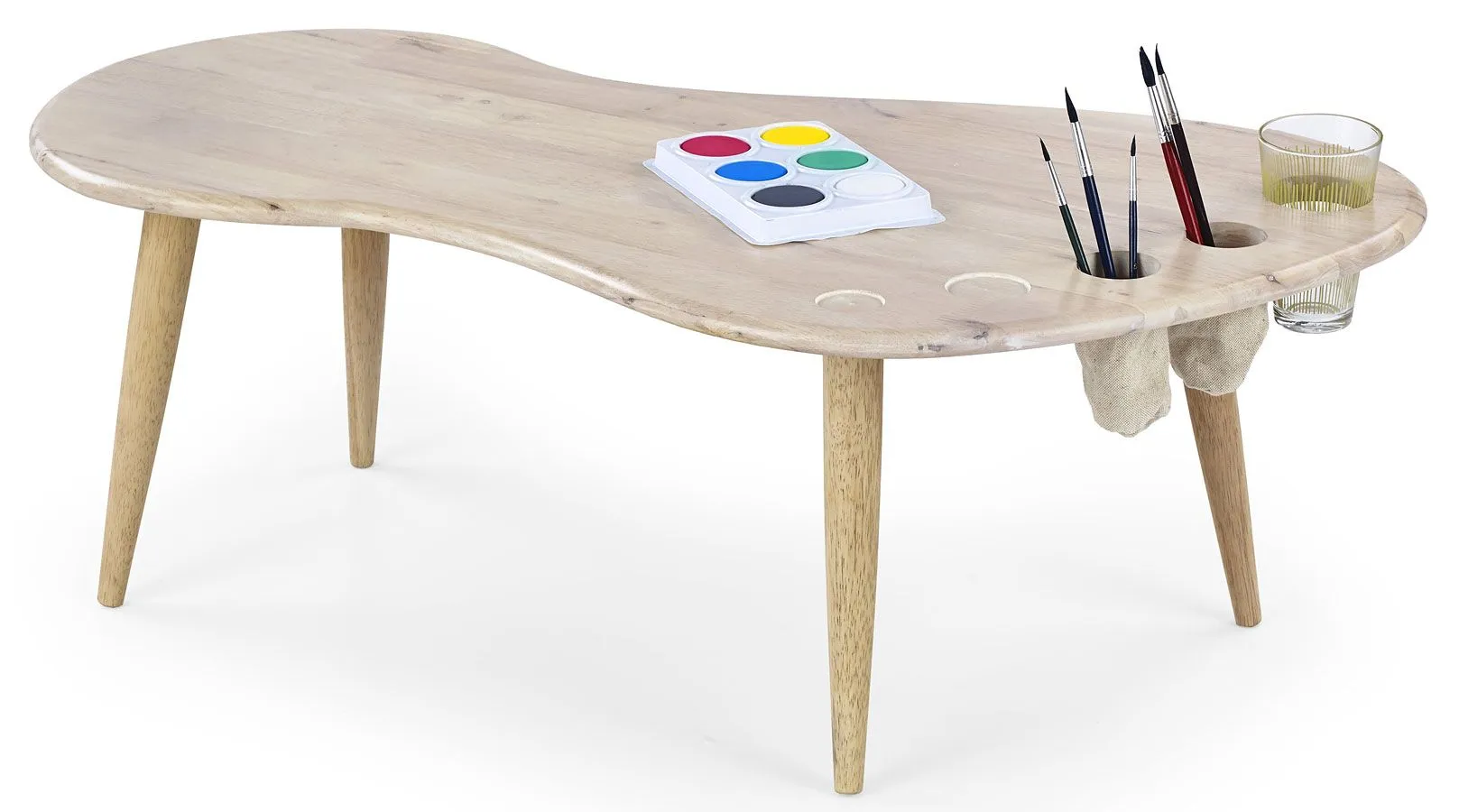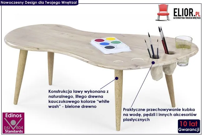 Komfortowy stolik dla dzieci i młodzieży Lofter wyróżnia się nie tylko swoją praktyczną formą oraz eleganckim kształtem, ale także zastosowaniem materiałów najlepszej jakości. Ława wykonana jest w całości z litego drewna kauczukowego, co gwarantuje jej trwałość i niepodatność na uszkodzenia i jest szczególnie istotne w przypadku artykułów dla dzieci. Uważaj na podobne produkty konkurencji, produkowane z klejonych płyt wiórowych i drewnopodobnych. Materiały te mogą zawierać substancje, które nie są obojętne dla zdrowia Twojego Dziecka! Stolik do malowania Lofter posiada specjalnie zaprojektowane wcięcia do przechowywania kubka na wodę, pędzelków i innych akcesoriów niezbędnych małemu Artyście. Zaokrąglony blat ławy i brak ostrych rogów gwarantują bezpieczeństwo Dziecka nawet w trakcie emocjonującej pracy twórczej. Podaruj radość Twoim najbliższym inwestując w wysokiej jakości stolik marki Elior.