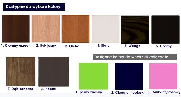- Dostępny w kolorach: Naturalna sosna, ciemny orzech, buk jasny, olcha, biały, wenge, czarny, dąb sonoma, popiel, jasny zielony, niebieski, różowy. Jeśli chcesz wybrać inny kolor blatu oraz konstrukcji mebla, wpisz odpowidnią informacje o zamawianych kolorach w polu "komenatarz" podczas składania zamówienia.