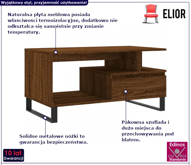 • Kolor: brązowy dąb. W naszej ofercie posiadamy także inne stoliki kawowe do salonu.