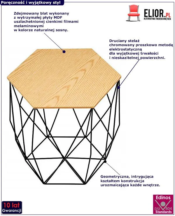 Meble oferowane przez markę Elior oprócz nowatorskiego designu, będącego na bieżąco z najnowszymi trendami, celują w najwyższe standardy w kwestii jakości wykonania. Góra stolika EISL to wysokogatunkowa płyta MDF w kolorze naturalnej sosny uszlachetniona cienkimi filmami melaminowymi, odporna na uszkodzenia i zarysowania. Podstawa stolika to profesjonalny metal o klasie higieny E1, chromowany proszkowo metodą elektrostatyczną, co dodatkowo wpływa na nieskazitelność i gładkość metalowej powierzchni. Śliczny stolik EISL mimo dyskretnych rozmiarów i delikatnej, niemal ażurowej, konstrukcji zwróci na siebie uwagę i sprowokuje pytania gości doceniających Twój dobry gust.