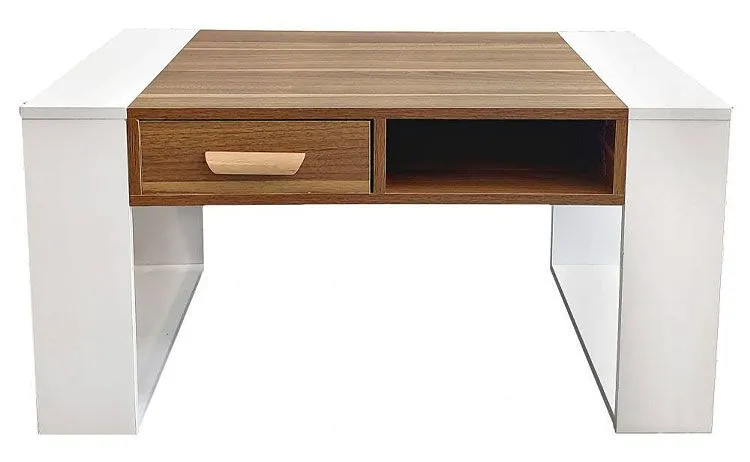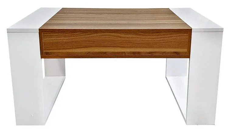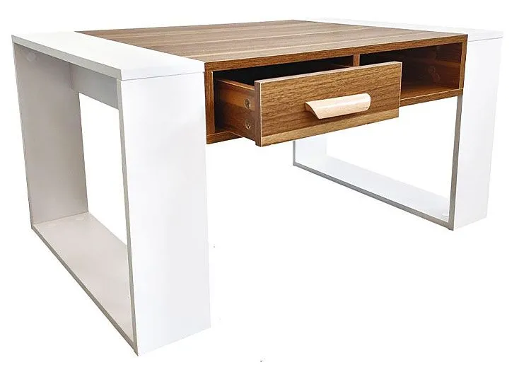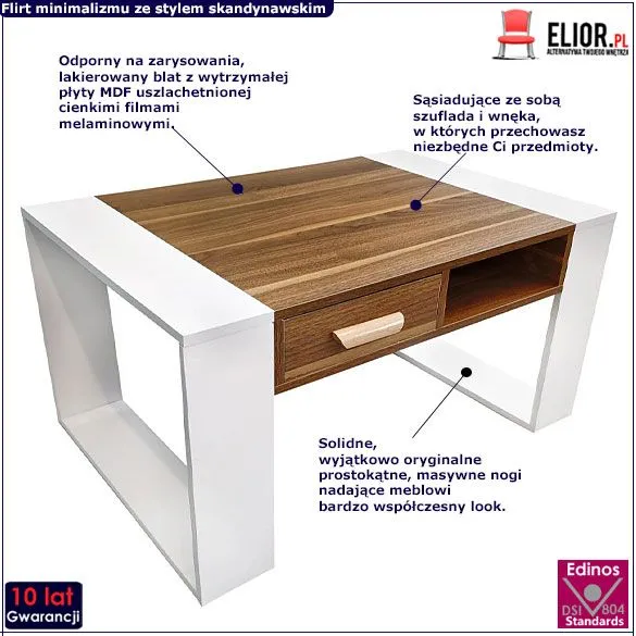 Płyta MDF, z której jest wykonany blat stolika została dodatkowo uszlachetniona cienkimi filmami melaminowymi; w połączeniu z jej naturalną niską porowatością gwarantuje to niesamowicie łatwe czyszczenie mebla i niską chłonność zabrudzeń. Jest to wymarzony wprost wybór dla mebli mających codzienną styczność z pożywieniem i napojami. W przeciwieństwie do konkurencyjnych produktów technologia Elior nie zawiera chloru, metali ciężkich ani związków ropopochodnych, dzięki czemu  meble nie przebarwiają się i jest to oczywiście optymalny, bo bezpieczny dla zdrowia wybór. Oprócz technologicznej strony, stolik  Rokus ma też dwie niewątpliwe zalety w postaci szuflady i wnęki pod blatem. Nie będziesz już z irytacją szukać wzrokiem gdzie odłożyć przedmioty, których używasz. Możesz także schować tu i mieć zawsze pod ręką książkę, świece zapachowe, talerzyk z ciastkami, serwetki stołowe, husteczki higieniczne czy cokolwiek Ci potrzeba. Sam przyznaj, że biało-orzechowy Rokus marki Elior oferuje właściwie wszystko, czego można wymagać od stolika kawowego.