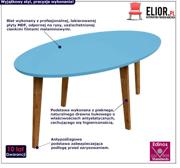 - Modna kolorystyka: niebieski, naturalne drewno bukowe. Kliknij w link i sprawdź także inne owalne stoliki w sklepie Edinos.pl. Stwórz swój praktyczny zestaw mebli.