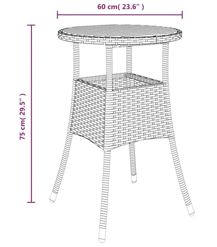 • Wymiary stołu: średnica 60 cm, wysokość 75cm.