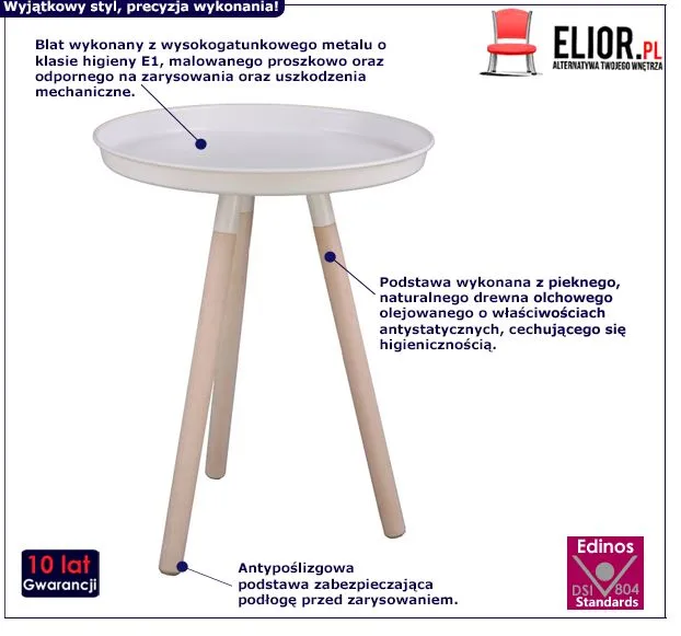 Skandynawsko zaprojektowany stolik Elgros jest meblem cechującym się ciekawą, urzekającą naturalnością formą. Jest to zasługa między innymi starannie dobranych i niezwykle trwałych materiałów meblarskich. Dzięki nim stolik użytkuje się naprawdę wygodnie, przyjemnie i co istotne – bez uszkodzeń przez wiele lat. Do produkcji stolika Elgros wykorzystano poddane specjalistycznej obróbce, nowoczesne surowce. Góra mebla to wysokogatunkowy metal o klasie higieny E1 malowany proszkowo, odporny na zarysowania oraz uszkodzenia mechaniczne w świetnym, białym wydaniu. Podstawa stolika to w pełni higieniczne, poddane profesjonalnej obróbce drewno olchowe olejowane o właściwościach antystatycznych. Jakże to istotne, by meble, w które inwestujemy cechowało wytrzymałe, staranne wykonanie. Na szczęście z wyjątkowym stolikiem Elgros nie trzeba się o to martwić! Ten pełen modernistycznego, a przy tym interesującego, szykownego charakteru mebel wciąż cieszy oko niebywałym wdziękiem. Elgros posiada bezsprzecznie wiele zalet – trwałość, stabilność, dokładne wykonanie, funkcjonalizm i oczywiście świeżą, pełną klasy i pomysłowości prezencję. Chyba każdy przyzna, że warto mieć tak ekstrawagancki i funkcjonalny mebel w swoich starannie i przemyślanie zaaranżowanych i wypielęgnowanych stylowo przestrzeniach.
