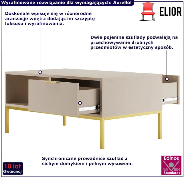 Czar nowoczesnego glamouru wkracza do Twojego wnętrza ze stolikiem kawowym  Pascal 7X marki Elior. Każdy szczegół tego stolika został zaprojektowany z myślą o tych, którzy cenią sobie luksus w codziennym życiu. Szlachetne wykończenia i smukłe linie sprawiają, że Pascal 7X przykuwa wzrok i dodaje charakteru każdej przestrzeni. Wyposażony w otwartą półkę i 2 szuflady zapewnia nie tylko miejsce na przechowywanie, ale i wyrafinowany akcent do Twojego wnętrza. Oto idealny dodatek, który harmonijnie połączy styl z praktycznością.