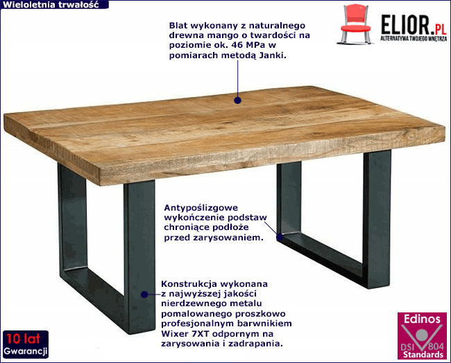 Zjawiskowy blat wyprodukowany został z egzotycznego, naturalnego drewna mango. Drewno mango wyróżnia się twardość zbliżoną do drewna tekowego, na poziomie ok. 46 MPa w pomiarach metodą Janki oraz dużą gęstością, powodująca zbitą i ciężką strukturę mebli. Co ważne, drewno mango jest odporne na działanie wilgoci, a pod wpływem wody nie zmienia swojego kształtu. Z powodu takich właściwości jest idealnym wyborem do produkcji stolików kawowych. Meble wykonane z mango charakteryzują się jasną, zielonkawo-brązową, niekiedy popielatą barwą przechodząca miejscami w charakterystyczne złote odcienie nadające drewnu mangowca niepowtarzalnego uroku i szlachetności. Gruboziarnista struktura, łatwo poddająca się obróbce - szczotkowaniu i piaskowaniu powoduje, że meble wykonane z tego surowca są niepowtarzalne i wyjątkowe, a jednocześnie niedrogie, dzięki dużej dostępności surowca. Masywne nogi wykonano z najwyższej jakości nierdzewnego metalu malowanego odpornym na zarysowania i zadrapania. Najwyższa jakość techniki polimeryzacji pozwoliła zaoferować firmie Elior aż 10 lat gwar. na swoje produkty. Zapomnisz o stresie, że po kilku latach część farby odpryśnie od mebla .