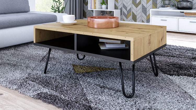 Marzy Ci się stworzenie miejsca, które będzie sprzyjało wspólnemu spędzaniu czasu z bliskimi? Do tego z pewnością potrzebne Ci są meble tworzące przemyślaną kompozycję całej aranżacji. Prezentowany przez nas stolik kawowy to gustowna propozycja uzupełniająca pustą przestrzeń przed wygodną sofą. Przyjemna kolorystyka nie będzie wpływać rozpraszająco, wręcz przeciwnie umili wspólnie spędzany czas. Elementem ozdobnym mebla, który pełni funkcję głównej dekoracji jest podstawa. Efektownie zaprojektowane nogi to jednocześnie solidna i bezpieczna podstawa, która zapewnia stabilność mebla. Praktyczne półki znajdujące się w optymalnej odległości od blatu posłużą jako miejsce na różne drobiazgi, książki czy pilot do telewizora. Mebel o takich cechach świetnie sprawdzi się w salonie, sypialni, pokoju młodzieżowym czy gabinecie zaaranżowanym w stylu nowoczesnym, minimalistycznym czy skandynawskim.