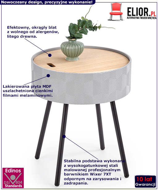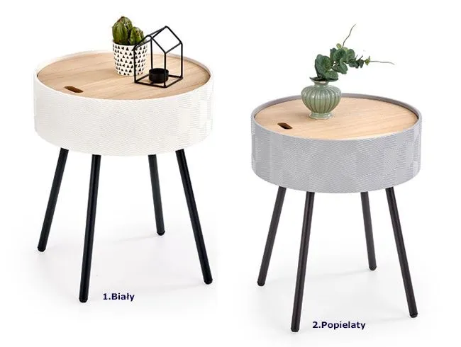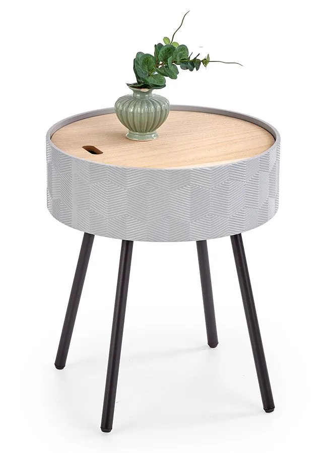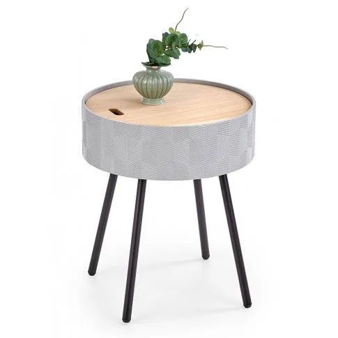 Ahis to największy hit wśród stolików kawowych! Połączenie wyjątkowego designu i ponadprzeciętnej funkcjonalności zamknięte w zgrabnym, designerskim meblu. Intrygująca szarość korpusu, szlachetna barwa naturalnego drewna i elegancka czerń nóżek tworzą wyjątkowo subtelną całość - mebel, który pozwoli Ci zrelaksować się po ciężkim dniu z kubkiem ulubionej herbaty. Doskonale odnajdzie się on zarówno we wnętrzu w stylu skandynawskim, minimalistycznym jak i nowoczesnym. To jednak nie wszystko! Ahis oprócz tego, że zaskakuje nietuzinkowym designem, posiada niesamowicie wiele zastosowań. Okrągły blat posłuży Ci jako taca do przenoszenia filiżanek lub talerzyków z przekąskami, a ukryty pod blatem schowek będzie doskonałym miejscem na przechowywanie drobiazgów takich jak pilot do telewizora, książka czy też ulubione przekąski przygotowane na wieczorny seans filmowy. Spodziewałeś się, że tak niewielki mebel może być tak praktyczny? Stolik kawowy Ahis to doskonałe uzupełnienie sofy wprowadzające do wnętrza niepowtarzalny klimat i wyjątkowy styl. Potencjał stolika możesz wykorzystać zarówno w salonie jak i sypialni, pokoju młodzieżowym czy też przestrzeniach komercyjnych. Podkreśl charakter Twojej aranżacji wprowadzając do niej nutkę modernistycznego szyku!