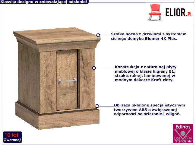 - Produkt posiada certyfikat jakości "Edinos Standards DSI 804", który potwierdza najwyższą jakość wykonania mebla oraz pełny stopień zgodności poszczególnych jednostek wytworzonego wyrobu z przyjętym wzorcem.