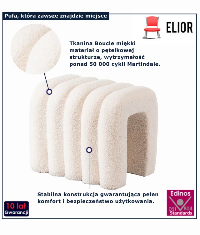 • Tkanina boucle to miękki i dekoracyjny materiał o pętelkowej strukturze oraz wysokiej odporności na ścieranie (nawet powyżej 50 000 cykli Martindale).
