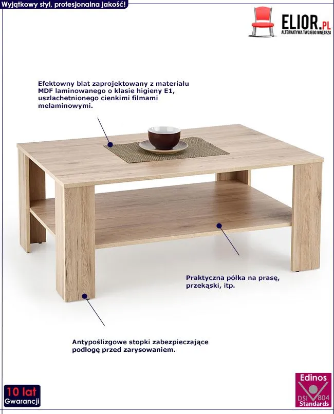 - Produkt posiada certyfikat jakości "Edinos Standards DSI 804", który potwierdza najwyższą jakość wykonania mebla oraz pełny stopień zgodności poszczególnych jednostek wytworzonego wyrobu z przyjętym wzorcem.