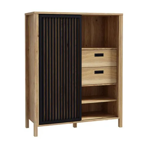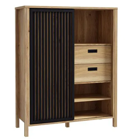 Komoda Dimon 4X została zaprojektowana tak, by maksymalnie ułatwić organizację 2 pojemne szuflady na prowadnicach z pełnym wysuwem, zamykana szafka i przesuwne drzwi z lamelami skrywające dodatkowe wnęki tworzą funkcjonalną całość, która łączy praktyczność z unikalnym wyglądem.