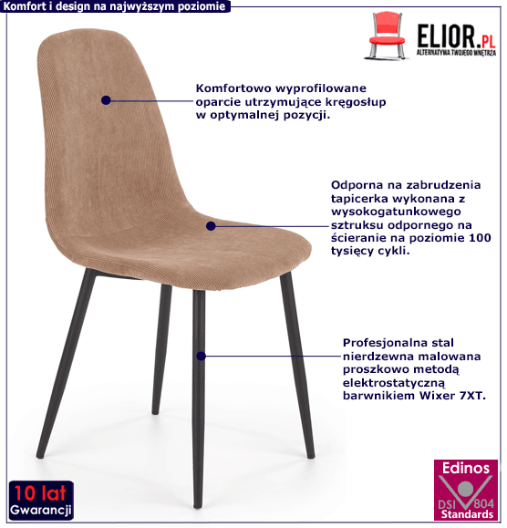 Wbrew pozorom minimalistyczne krzesła wymagają niezwykle ciężkiej pracy, aby mogły zachwycać tak niezwykłym i czarującym designem. Krzesła Mavo powstawały pod okiem najlepszych projektantów, designerów i inżynierów marki Elior. Dzieło tak doskonałe w swojej prostocie to połączenie solidnych i trwałych surowców, które najpierw zostały wyselekcjonowane spośród wielu innych. Aby krzesło wyróżniało się nieprawdopodobną wytrzymałością do jego konstrukcji użyta została profesjonalna stal nierdzewna. To mocny i stabilny materiał gwarantujący długie użytkowanie. Stal pomalowano metodą proszkową , wykorzystując nowoczesną technikę elektrostatyczną. Dzięki temu mebel wyróżnia się niezwykłą odpornością na chemikalia, korozje i uszkodzenia mechaniczne. Przytulna tapicerka krzesła Mavo to wysokogatunkowy, bardzo ceniony i wiecznie modny sztruks. Jest jedną z najlepszych tkanin obiciowych, gdyż cechuje się wysoką wytrzymałością i dużą odpornością na ścieranie - 100 tysięcy cykli. Delikatne mikrowłoski na materiale sprawiają, że sztruks jest niesamowicie przyjemny w dotyku. Podnosi to też walory estetyczne mebla, wprowadzając ciepły i przytulny klimat. Całość wykonana została z olbrzymią precyzją, dzięki której krzesło prezentuje się nieskazitelnie. Przekonaj się już dziś, ile dobrego wniesie do Twojej codzienności.