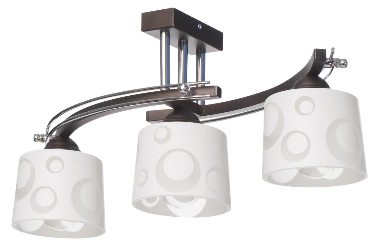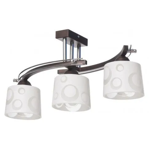 Lampa sufitowa E358-Bristol wenge to klasyczny produkt o ciekawym wyglądzie. Jego znakiem szczególnym są szklane klosze, przyozdobione kolistym wzorem. Dzięki prostej palecie barw, bez problemu wkomponujesz go w dowolne pomieszczenie.  Lampa ta została wykonana z materiałów najwyższej jakości, przez co świetnie się prezentuje zachowując przy tym walory niezawodności. Szczególnie polecana do klasycznych wnętrz.
