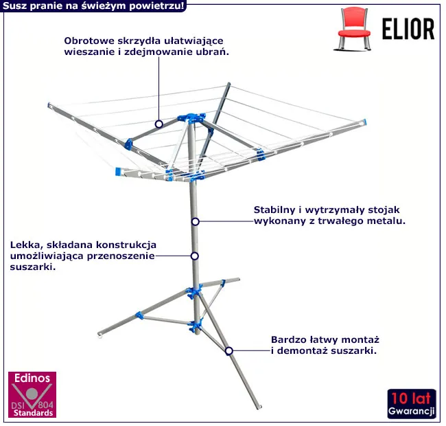 Pozwól sobie na komfortowe suszenie prania: latem w ogrodzie, zimą w domu. Takie możliwości zapewni Ci suszarka Jonatax marki Edinos Premium. Zainwestuj w wygodę i jakość, które Cię usatysfakcjonują. Już dziś możesz zamówić tę suszarkę ogrodową w świetnej cenie - 328 zł!