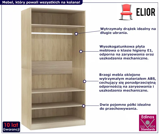 Masz dosyć ciągłego bałaganu w swojej garderobie? Twoje ubrania wychodzą z szafy, jakby szukały wolności? Pragniesz rozwiązania, które pozwoli Ci zachować porządek i sprawi, że Twoje ubrania będą miały swój własny kawałek przestrzeni? Mamy dla Ciebie idealne rozwiązanie! Oto nasza otwarta szafa bez drzwiczek Bianco marki Edinos Premium, która jest zaprojektowana specjalnie dla Ciebie! Ta szafa z drążkiem i dwiema połkami pozwoli Ci na przechowywanie swoich ubrań w najlepszy sposób. Bez drzwi, masz łatwy dostęp do swojej garderoby i możesz łatwo znaleźć to, czego szukasz. A co z dwiema półkami? To dodatkowa przestrzeń na przechowywanie bielizny, skarpetek i innych akcesoriów w ozdobnych pojemnikach.