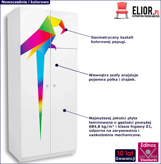 Dzieci uwielbiają wzory i kolory. W estetycznie urządzonym wnętrzu miło się odpoczywa, bawi i uczy. Komplet mebli Elif to wyjątkowa kolekcja dedykowana najmłodszym fanom dobrego designu. Jednym z jej elementów jest szafa Polin 19X, obok której żadne dziecko nie przejdzie obojętnie. Fronty szafy ozdobiliśmy geometryczną papugą, która stanowi wspaniałą ozdobę mebla. Kolorowa papuga nada każdemu wnętrzu unikalnego charakteru. Jesteśmy pewni, że do pokoju Twojej pociechy już nigdy nie wkradnie się nuda. Grafikę nanieśliśmy za pomocą nowoczesnej hybrydowej drukarki UV, dzięki czemu nadruk jest trwały, odporny na ścieranie i niezwykle atrakcyjny wizualnie. Korpus i fronty szafy Polin 19X wykonaliśmy w pasującym do każdego wnętrza białym kolorze. Biały to uniwersalny kolor, który spodoba się zarówno chłopcom, jak i dziewczynkom.