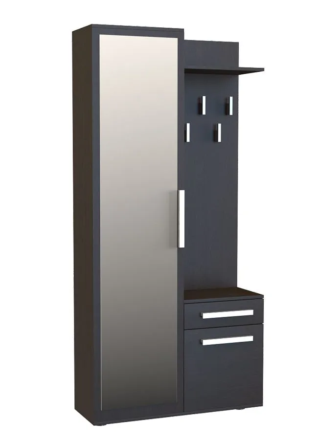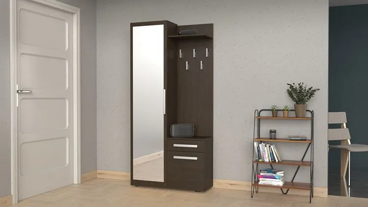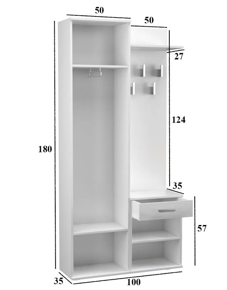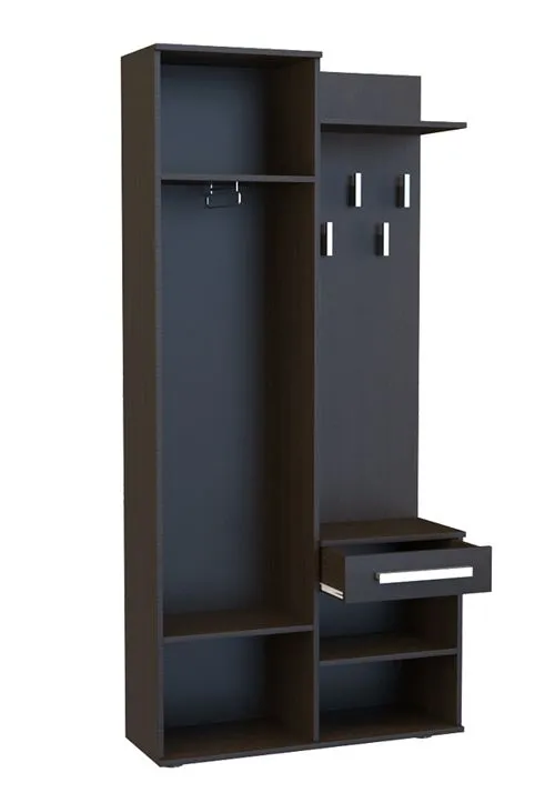 - Odpowiednio zorganizowana przestrzeń do przechowywania z pojemnymi półkami, szufladą, wieszakami na kurtki i zamykaną częścią na ubrania wiszące.