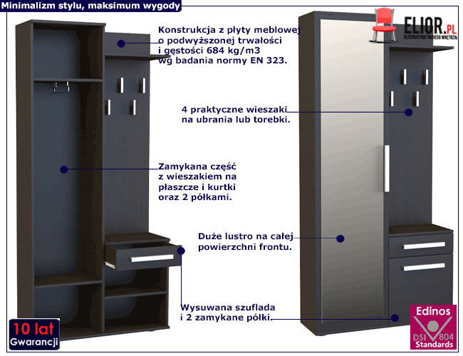 Garderoba to szczególny mebel, bez którego trudno okiełznać bałagan w naszych przedpokojach, holach i wiatrołapach. Garderoba musi być wystarczająco pojemna, by zmieścić okrycia wierzchnie, szale i czapki, a także wszystkie rzeczy, których potrzebujemy przed wyjściem z domu, a jednocześnie nie powinna przytłoczyć pomieszczenia. Praktyczna garderoba Balex 2X z racjonalnie zaplanowaną przestrzenią do przechowywania posiada 2 otwarte podręczne półki oraz 4 wieszaki służące do odwieszenia kurtek. W dolnej części mieści się wysuwana szuflada oraz 2 zamykane półki na drobiazgi. W wysokiej zamykanej części garderoby mieszczą się 2 pojemne półki oraz przestrzeń z wieszakiem na płaszcze, garnitury, dzięki której ubrania będą przechowywane swobodnie i nie będą narażone na zagniecenia. Duże lustro na froncie szafy pełni funkcję praktyczną, ale także dekoracyjną powiększając optycznie i rozjaśniając pomieszczenie. Tak zaprojektowana szafa doskonale zorganizuje przestrzeń nawet w niewielkim przedpokoju lub holu. Minimalistyczny design, klasyczna kolorystyka oraz stylowe detale to propozycja, która sprawdzi się w niejednej aranżacji, od loftowej, klasycznej, aż po wnętrza z nutką skandynawską. Ponadczasowy styl mebla oraz jego stonowana elegancja spowodują, że Balex 2X łatwo dopasuje się stylistycznie do innych mebli przedpokojowych. Balex 2X to modernistyczna propozycja marki Elior dla wszystkich poszukiwaczy idealnej garderoby, łączącej w jedną doskonałą całość praktyczny aspekt mebla z jego urodą. Już nie musisz wybierać między szafą, która jest ładna, a garderobą, która jest praktyczna. Balex 2X to styl i funkcjonalność w jednym. Sprawdź jak fantastycznie zorganizujesz swoją przestrzeń z szafą Balex 2X już dziś!