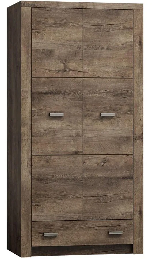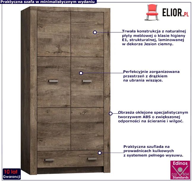 Szafę Filin 2X zrobiliśmy z najwyższej jakości 16 mm laminowanej płyty meblowej o klasie higieny E1. Płyta charakteryzuje się ciekawą strukturą, która idealnie odwzorowuje naturalną fakturę i usłojenie drewna. Brzegi mebla zostały precyzyjnie oklejone specjalistycznym tworzywem ABS o zwiększonej odporności na ścieranie i wilgoć. Drzwi zamontowane na 35 mm zawiasach puszkowych, regulowanych w 3 płaszczyznach są otwierane uchylnie za pomocą stylowych uchwytów z trwałego metalu. Przestronne wnętrze szafy zostało zorganizowane w wyjątkowo funkcjonalny sposób. W zamykanej części umieściliśmy stabilny drążek o długości 92 cm na płaszcze, kurtki i ubrania wizytowe. W dolnej części mieści się praktyczna szuflada, głęboka na 58 cm, zamontowana na trwałych prowadnicach kulkowych z systemem pełnego wysuwu. Tak wykonana szafa Filin 2X to kwintesencja ponadczasowej jakości i zawsze modnego funkcjonalizmu. Postaw tę wyjątkową szafę w swoim wnętrzu i przekonaj się jak wszystko się świetnie układa!
