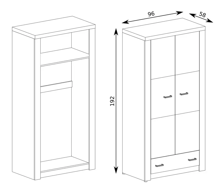 - Wymiary całkowite: wysokość: 192 cm, szerokość: 96 cm, głębokość: 58 cm.