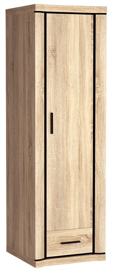 Szafę Rectano 20X zrobiliśmy z najwyższej jakości 16 mm laminowanej płyty meblowej o klasie higieny E1. Płyta charakteryzuje się ciekawą strukturą, która idealnie odwzorowuje naturalną fakturę i usłojenie drewna. Dla podniesienia efektu dekoracyjnego brzegi mebla ozdobiliśmy szprosami w kolorze czarnym, które subtelnie podkreślają szlachetne wybarwienie dębu sonoma. Brzegi szafy zostały precyzyjnie oklejone specjalistycznym tworzywem ABS o zwiększonej odporności na ścieranie i wilgoć. Drzwi zamontowane na trwałych zawiasach są otwierane uchylnie za pomocą stylowych uchwytów z trwałego metalu. Przestronne wnętrze szafy zostało zorganizowane w przemyślany i funkcjonalny sposób. Za uchylnymi drzwiami znajduje się stabilny stabilny drążek na płaszcze, kurtki i ubrania wizytowe. W dolnej części umieściliśmy pojemną szufladę na prowadnicach rolkowych z systemem pełnego wysuwu. Tak wykonana szafa Rectano 20X to doskonały sposób na przechowywanie i niesztampową aranżację wnętrza.