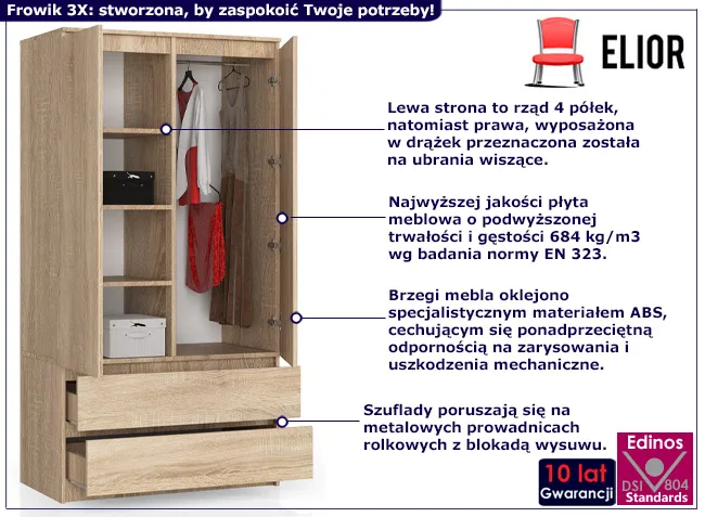 Conrad 3X od Edinos Premium – dwudrzwiowa szafa z szufladami to idealny wybór dla tych, którzy szukają uniwersalnego mebla, który doskonale uzupełni wyposażenie sypialni, przedpokoju, czy pokoju dziennego. Wewnątrz szafy Conrad 3X znajdziesz dwie pojemne szuflady, idealne do przechowywania bielizny, poszew na kołdry, prześcieradeł czy innych tekstyliów. Uchylnymi drzwiami otworzysz drogę do jeszcze większej przestrzeni – czterech pojemnych półek oraz praktycznego drążka na wieszaki. Eleganckie wykończenie oraz przemyślana kolorystyka sprawiają, że szafa doskonale wkomponuje się zarówno w klasyczne, jak i nowoczesne aranżacje wnętrz.