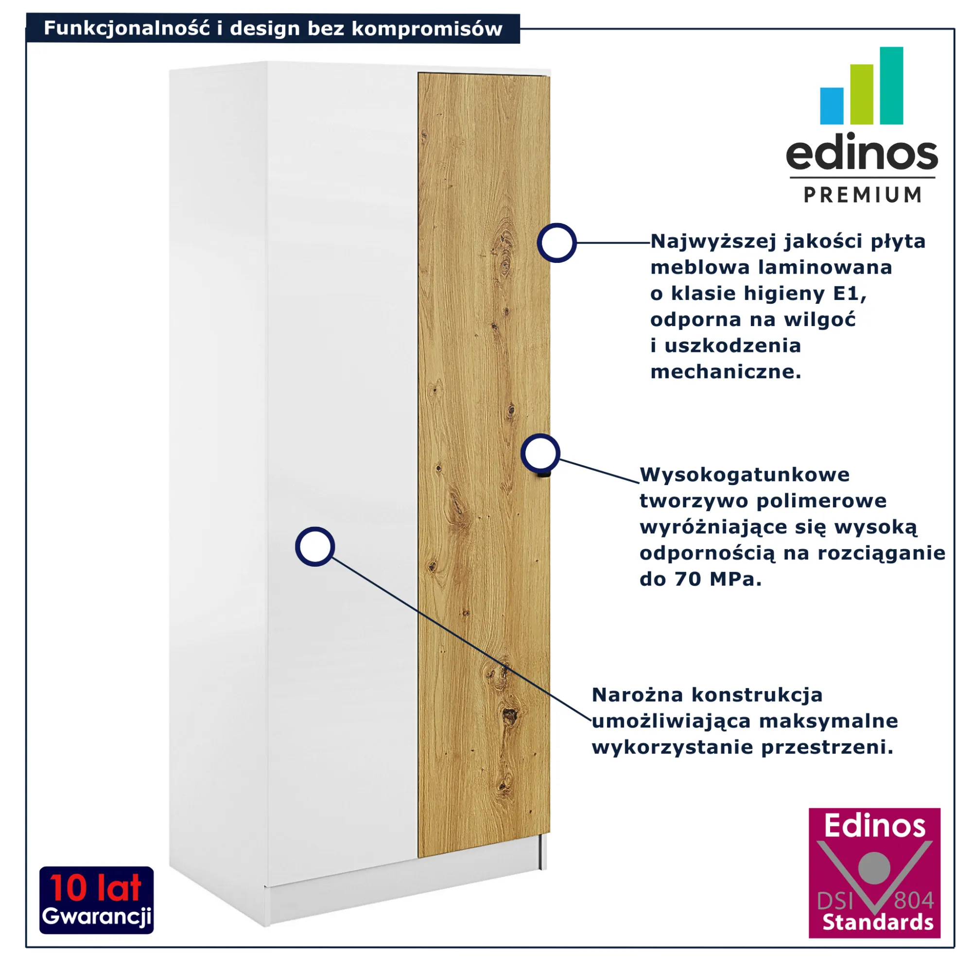 • Produkt posiada certyfikat jakości "Edinos Standards DSI 804", który potwierdza najwyższą jakość wykonania mebla oraz pełny stopień zgodności poszczególnych jednostek wytworzonego wyrobu z przyjętym wzorcem.