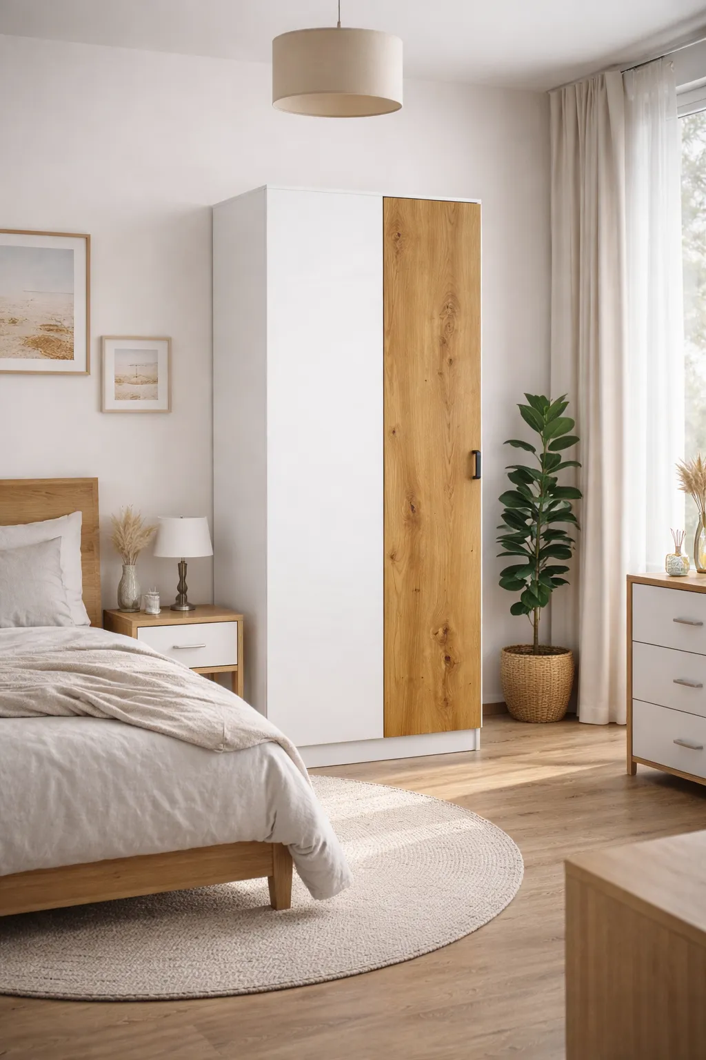 Aranżacja sypialni z wykorzystaniem szafy Axelor biały + dąb artisan
