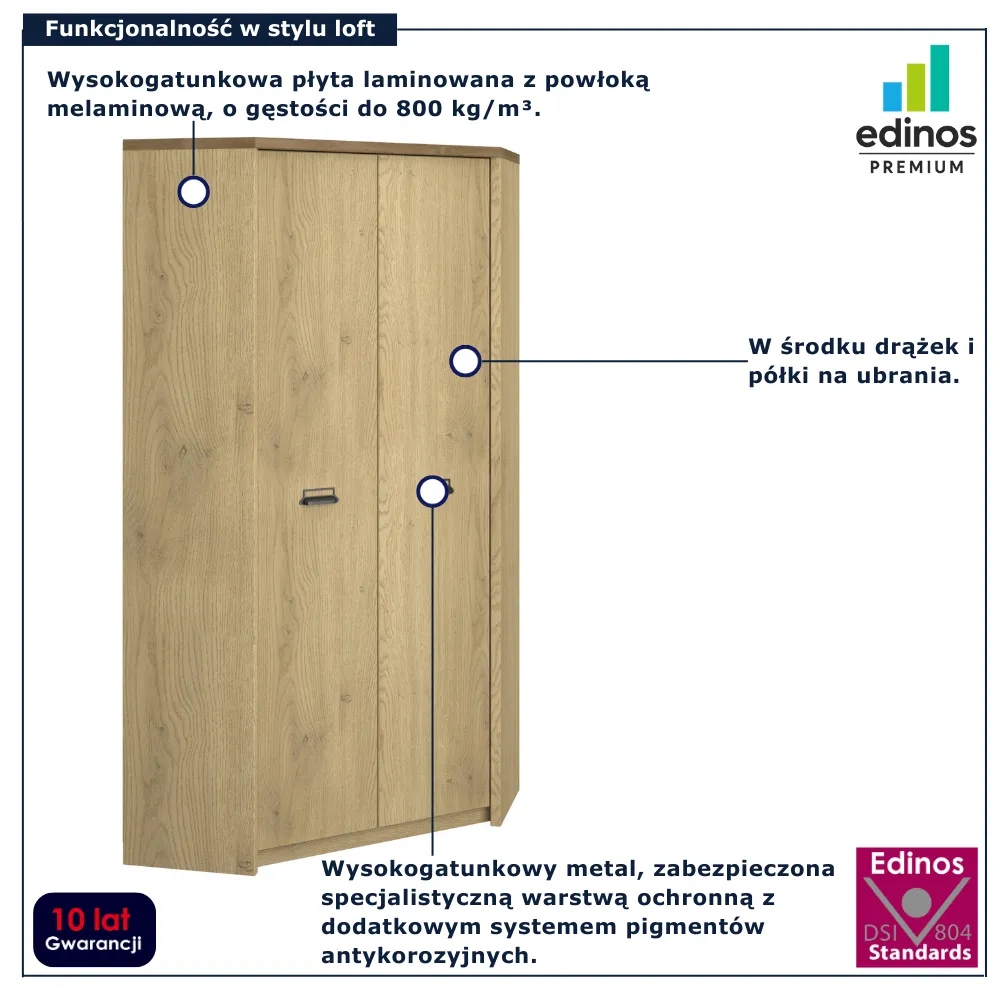 Szafa narożna Sevisso 9X marki Edinos Premium to połączenie maksymalnej funkcjonalności, solidności i stylu, które odmienia codzienne przechowywanie. Jeśli szukasz mebla, który wykorzysta przestrzeń do maksimum i jednocześnie podkreśli loftowy charakter wnętrza, ten model będzie doskonałym wyborem – dostępny w cenie 1758 zł.