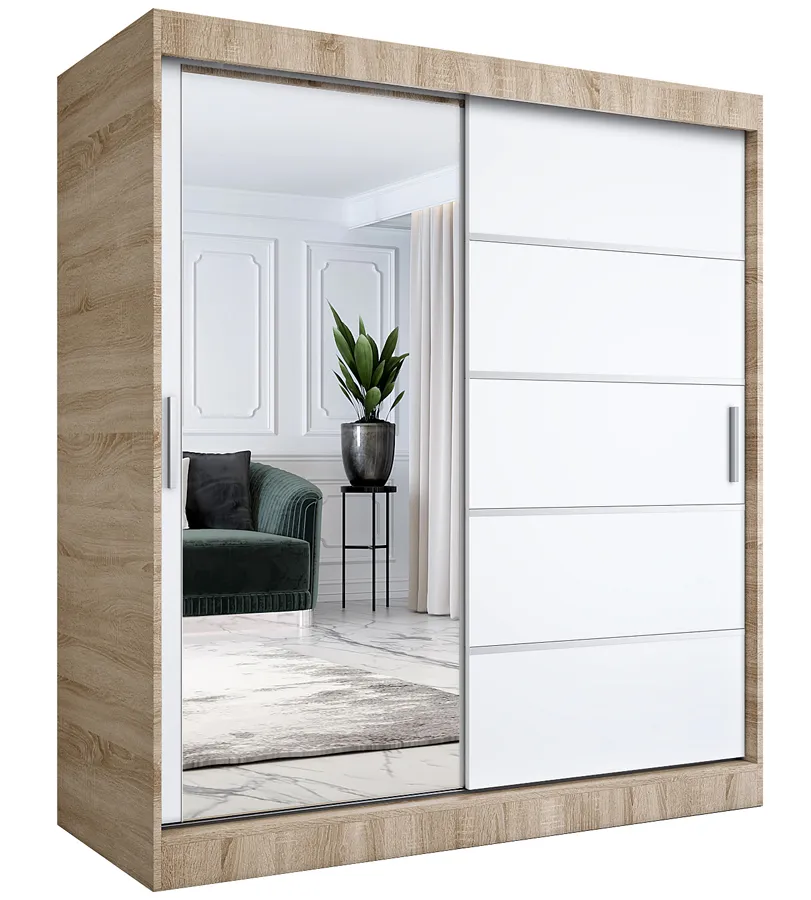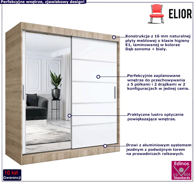 Szafa przesuwna z lustrem Ebia 5X 180 cm w kolorze dąb sonoma + biały w promocyjnej cenie 1538 zł (zamiast 1868 zł) tylko w tej ofercie!!! Zamawiając ją już teraz zyskujesz aż 330 zł rabatu!