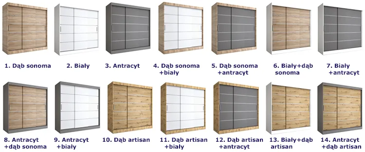 Dostępne opcje kolorystyczne szafy przesuwnej 200 cm Bohosa 6X
