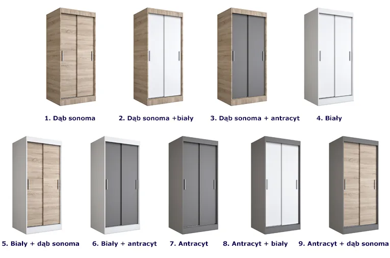 - Modny kolor: Biały + Antracyt. W ofercie posiadamy także inne kolory szafy Erco 2X: Dąb sonoma, Dąb Sonoma + Biały, Dab sonoma + Antracyt, Biały, Biały + Dąb Sonoma, Antracyt, Antracyt + Biały, Antracyt + Dąb Sonoma.