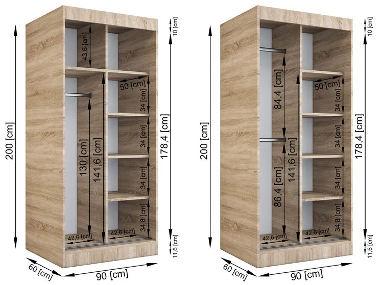 - Wymiary całkowite: szerokość: 90 cm, głębokość: 60 cm, wysokość: 200 cm.