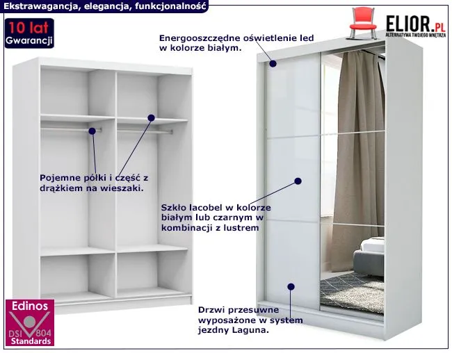 • Biała szafa z frontem ze szkła lacobel w kolorze białym i lustra. Możliwości kombinacji kolorystycznych korpusów z frontami: lacobel biały, lacobel czarny, lacobel biały lustro, lacobel czarny lustro.