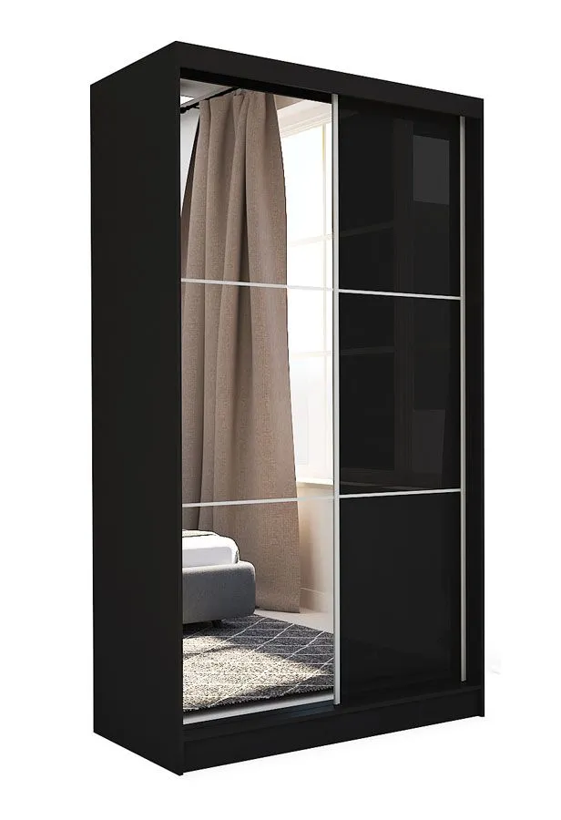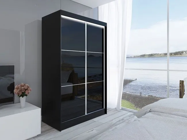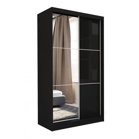 • Czarna szafa z frontem ze szkła lacobel w kolorze czarnym i lustra. Możliwości kombinacji kolorystycznych korpusów z frontami: lacobel biały, lacobel czarny, lacobel biały lustro, lacobel czarny lustro.