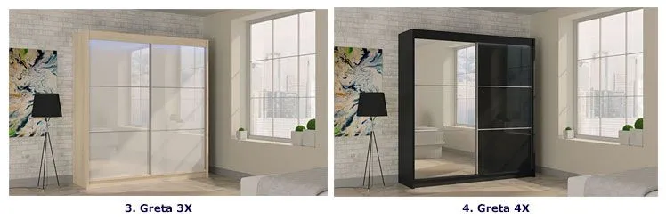 W ofercie posiadamy szafę Greta o wymiarach 120x216 cm, Selen 2X 150x216 cm, Greta 3X 180x216 cm, oraz Greta 4X 200x216 cm. Poniżej prezentujemy przykładowe wizualizacje dla powyższych modeli szafy: