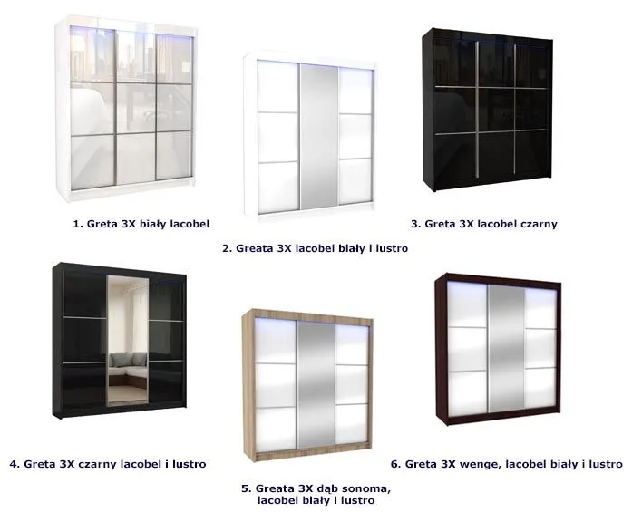 W ofercie posiadamy szafę Greta o wymiarach 120x216 cm, Greta 2X 150x216 cm, Greta 3X 180x216 cm, oraz Greta 4X 200x216 cm.