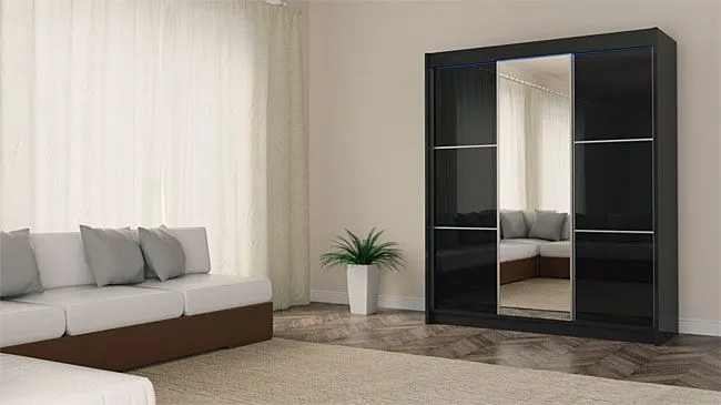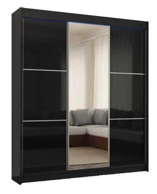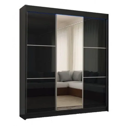 • Czarna szafa z fronetm ze szkła lacobel w kolorze czarnym i lustra. Możliwości kombinacji kolorystycznych korpusów z frontami: lacobel biały, lacobel czarny, lacobel biały lustro, lacobel czarny lustro.