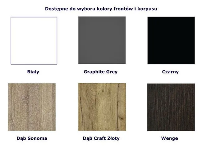 - Dostępne są inne kolory korpusu i frontów: czerń, graphite grey, wenge, dąb sonoma, dąb craft złoty. Wybór kolorów frontów: szkło lacobel białe, czarne, lacobel biały lustro, lub lacobel czarny lustro. Poinformuj nas w komentarzu do zamówenia lub drogą mailową jaki kolor frontu wybierasz. Kliknij w link i sprawdź także inne