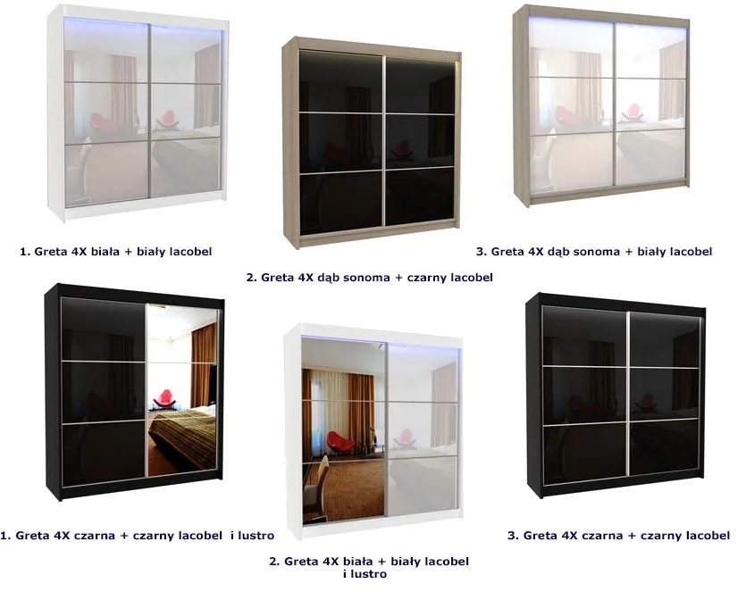 W ofercie posiadamy szafę Greta o wymiarach 120x216 cm, Greta 2X 150x216 cm, Greta 3X 180x216 cm, oraz Selen 4X 200x216 cm.