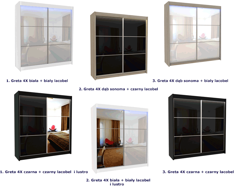 Poniżej prezentujemy kombinacje dostępnych frontów szafy Greta: