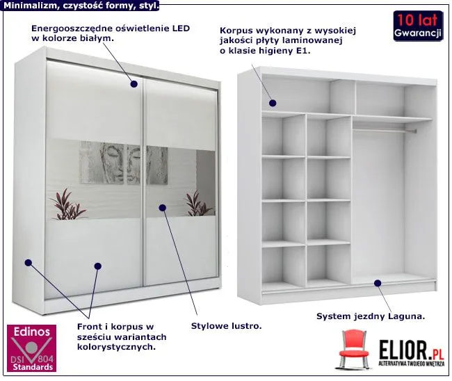 Najpiękniejsze jest to, co niebanalne, nietuzinkowe, niepowtarzalne, stworzone z miłości. Szafa Diki powstała nieprzypadkowo. To symbol bogactwa zamknięty w powściągliwą formę. Stonowane barwy korpusu, okraszone czystą bielą tudzież hipnotyzującą czernią frontów, splecione w lustrzanym uścisku, stanowią o wyjątkowej urodzie naszej iście królewskiej szafy. Diki pięknie odbijająca światło naturalne jak i sztuczne, ociepli i powiększy wnętrze Twojej sypialni, gabinetu, czy przedpokoju. Dodatkowe energooszczędne światło LED zachęca by przy jego blasku wieczorne rozmowy nie miały końca... Dzięki niekrzykliwej formie szafy, dopełnisz jej obecnością zarówno aranżacje w stylu minimalistycznym, skandynawskim, nowoczesnym, modernistycznym, nowojorskim, japońskim, futurystycznym, jak i glamour niezależnie od miejsca przeznaczenia.