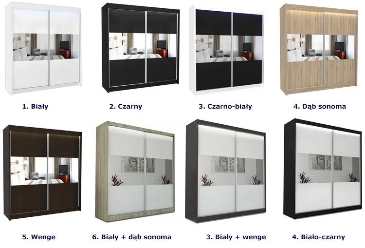 - Dostępne kolory korpusów: biel, czerń, graphite grey, wenge, dąb sonoma, dąb craft złoty. Poinformuj nas w komentarzu do zamówenia lub drogą mailową jaki kolor frontu wybierasz. Kliknij w link i sprawdź także inne szafy przesuwne w sklepie Edinos.pl.