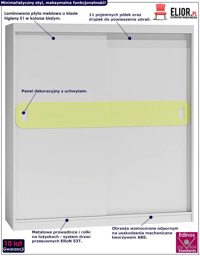Szafa wykonana została z laminowanej płyty meblowej grubości 16 mm o klasie higieny E1, uszlachetnionej cienkimi filmami melaminowymi. Posiada także specjalne włókna ułożone różnokierunkowo o strukturze sinusoidalnej, co zapewnia nadanie jej cech jakościowych oraz wytrzymałościowych. Dla zwiększenia wytrzymałości i trwałości mebla, obrzeża szafy wykończono odpornym na uszkodzenia mechaniczne tworzywem ABS. 11 pojemnych półek jest wyjątkowo praktycznych i zapewnia komfortowe przechowywanie nie tylko odzieży czy dodatków. Ukryte za drzwiami półki oraz drążek na ubrania wierzchnie umożliwiają Ci funkcjonalne posegregowanie garderoby i jej estetyczny wygląd. Do swojej garderoby z łatwością dostaniesz się dzięki profesjonalnemu systemowi drzwi przesuwnych ERoN 53T - metalowe prowadnice o rolki na łożyskach gwarantują lekkie i płynne otwieranie/zamykanie szafy.