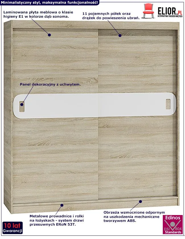 Szafa wykonana została z laminowanej płyty meblowej grubości 16 mm o klasie higieny E1, uszlachetnionej cienkimi filmami melaminowymi. Posiada także specjalne włókna ułożone różnokierunkowo o strukturze sinusoidalnej, co zapewnia nadanie jej cech jakościowych oraz wytrzymałościowych. Dla zwiększenia wytrzymałości i trwałości mebla, obrzeża szafy wykończono odpornym na uszkodzenia mechaniczne tworzywem ABS. 11 pojemnych półek jest wyjątkowo praktycznych i zapewnia komfortowe przechowywanie nie tylko odzieży czy dodatków. Ukryte za drzwiami półki oraz drążek na ubrania wierzchnie umożliwiają Ci funkcjonalne posegregowanie garderoby i jej estetyczny wygląd. Do swojej garderoby z łatwością dostaniesz się dzięki profesjonalnemu systemowi drzwi przesuwnych ERoN 53T - metalowe prowadnice o rolki na łożyskach gwarantują lekkie i płynne otwieranie/zamykanie szafy.
