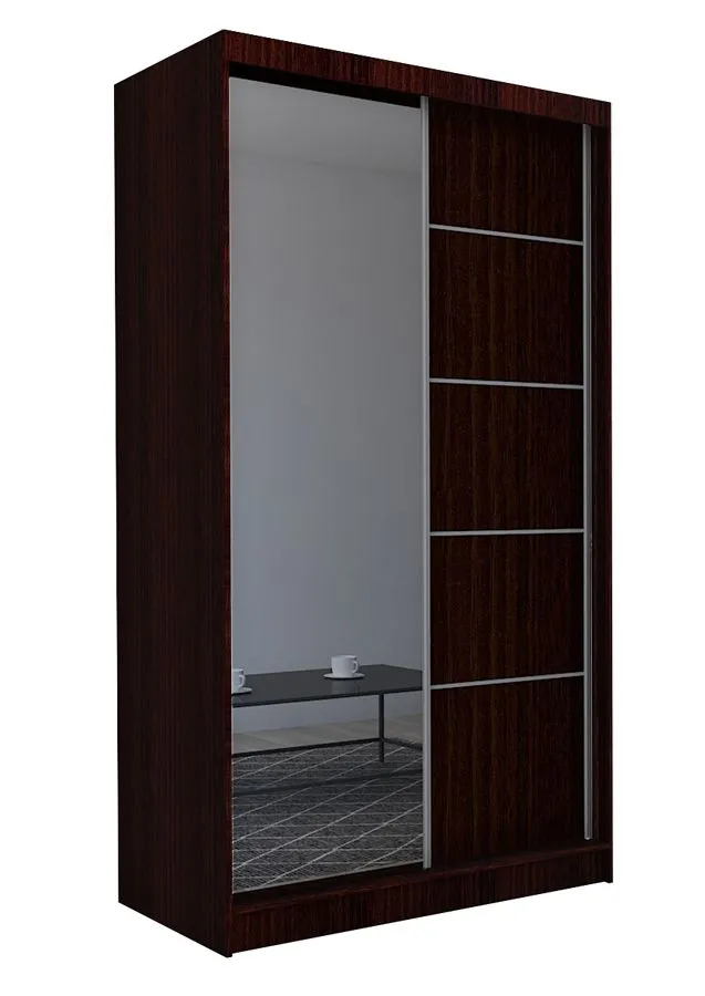 Szafa Ovos 2X w kolorze wenge to komfortowy mebel do sypialni, pokoju dziennego lub przedpokoju, gdzie będzie pełnić rolę rodzinnej garderoby. Szafa zachwyca elegancką linią oraz ciekawą kolorystyką frontów do wyboru. Dodatkowym atutem są aluminiowe listwy, tzw. szprosy wiedeńskie, podkreślające minimalistyczny i nowoczesny design szafy i nadające wnętrzu charakteru subtelnej elegancji. Duże lustro na froncie rozjaśnia i optycznie powiększa niewielkie pomieszczenie. Pojemna i szeroka na 120 cm szafa pomieści wszystkie ubrania, odzież wierzchnią, dodatki, a także ubrania sezonowe. To nowoczesna propozycja, która sprawdzi się w niejednej aranżacji, od minimalistycznej po styl skandynawski, a szeroka gama kolorystyczna frontów spowoduje, że szafa łatwo dopasuje się stylistycznie do mebli, które już posiadasz. Sprawdź jak idealnie urządzisz swoje wnętrze z szafą Ovos 2X marki Elior.