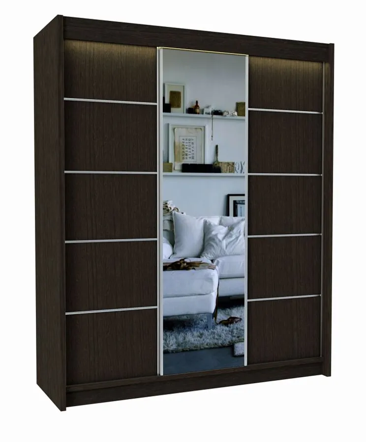 Szafa Ovos 4X w kolorze wenge to komfortowy mebel do sypialni, pokoju dziennego lub przedpokoju, gdzie będzie pełnić rolę rodzinnej garderoby. Szafa zachwyca elegancką linią oraz ciekawą kolorystyką frontów do wyboru. Duże lustro na froncie optycznie powiększa niewielkie pomieszczenie. Dodatkowym atutem jest energoszczędne oświetlenie LED w kolorze białym pokreśli minimalistyczny i nowoczesny design szafy i nada wnętrzu charakteru subtelnej elegancji. Pojemna i szeroka na 180 cm szafa pomieści wszystkie ubrania, odzież wierzchnią, dodatki, a także ubrania sezonowe i walizki. Jest to nowoczesna propozycja, która sprawdzi się w niejednej aranżacji, od minimalistycznej po styl skandynawski. Jej uniwersalny styl i subtelna elegancja spowoduje, że szafa łatwo dopasuje się stylistycznie do innych mebli. Sprawdź jak bajecznie urządzisz swoje wnętrze z wymarzoną szafą Ovos 4X marki Elior.